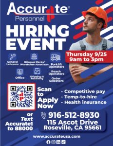Accurate Personnel is hiring! They’ll be on-site and looking to fill multiple positions during this walk-in interview event. No appointment needed – just bring your resume and enthusiasm. For questions, please contact info@goldensierra.com or call (916) 746-7722.