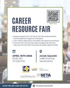 Explore careers with UC Davis, the City of Sacramento, and 25 additional regional employers. Learn about the application process and attend workshops. Connect with community resource agencies that can help you find the right training and career opportunities.