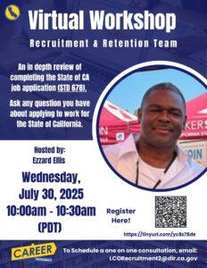 This virtual workshop is hosted by Ezzard Ellis. If you are interested in applying for a job with the State of California and don’t know where to begin, start here. This session will give you a better understanding of the overall state hiring process.