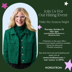 Nordstrom is hosting a hiring event at the Galleria at Roseville! No appointment needed – join any time during the event for an interview. You are welcome to bring a copy of your resume, but it is not required. On-the-spot job offers will be made for most roles.